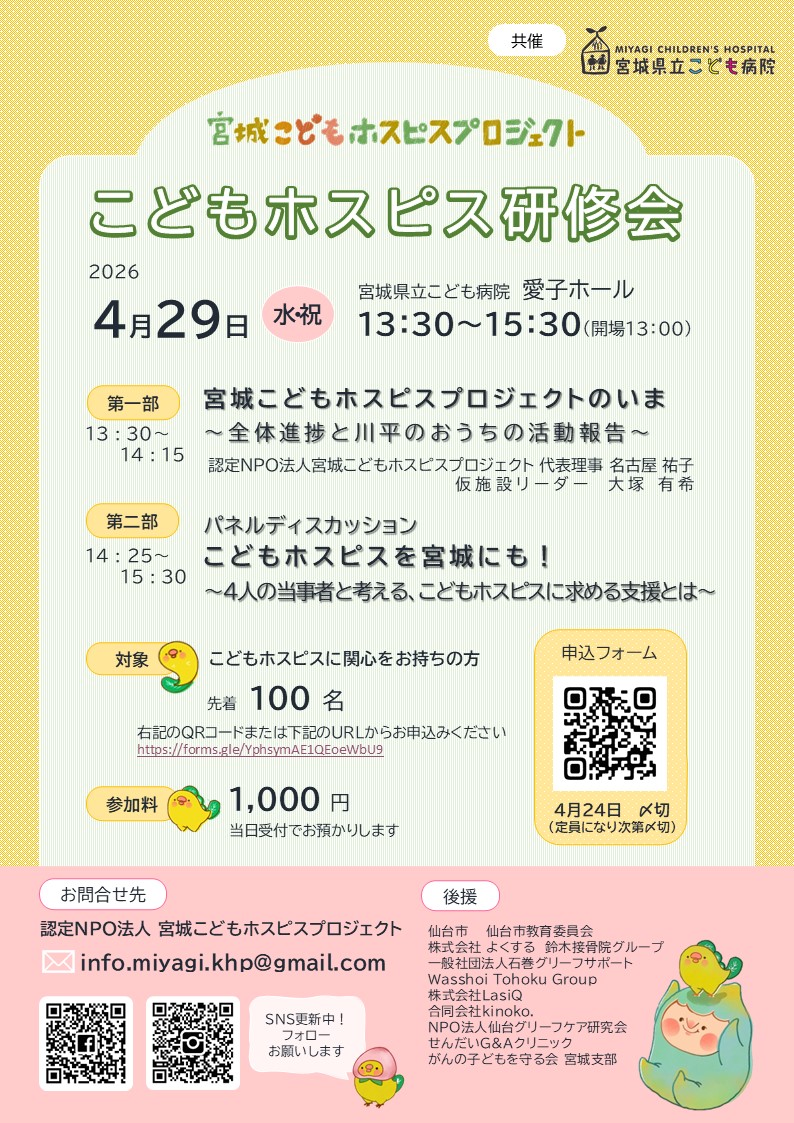 私たち株式会社よくするが活動をサポートしているNPO法人 宮城こどもホスピスプロジェクトの研修会のご案内です!